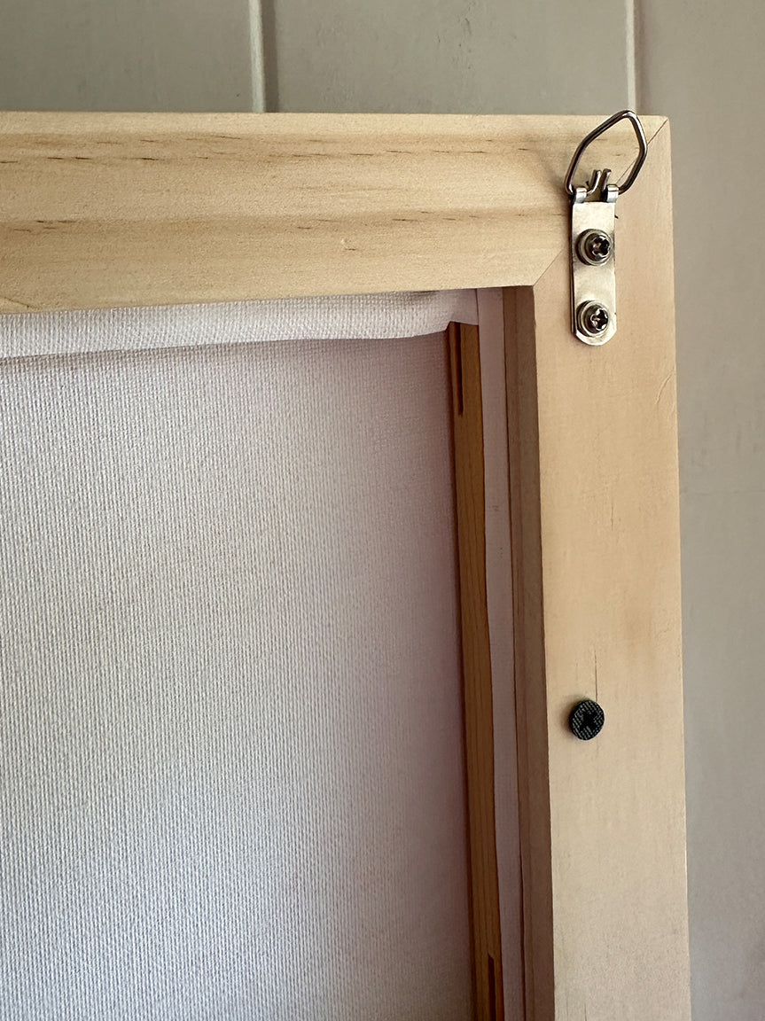 Framed in pine wood. Ready to hang.